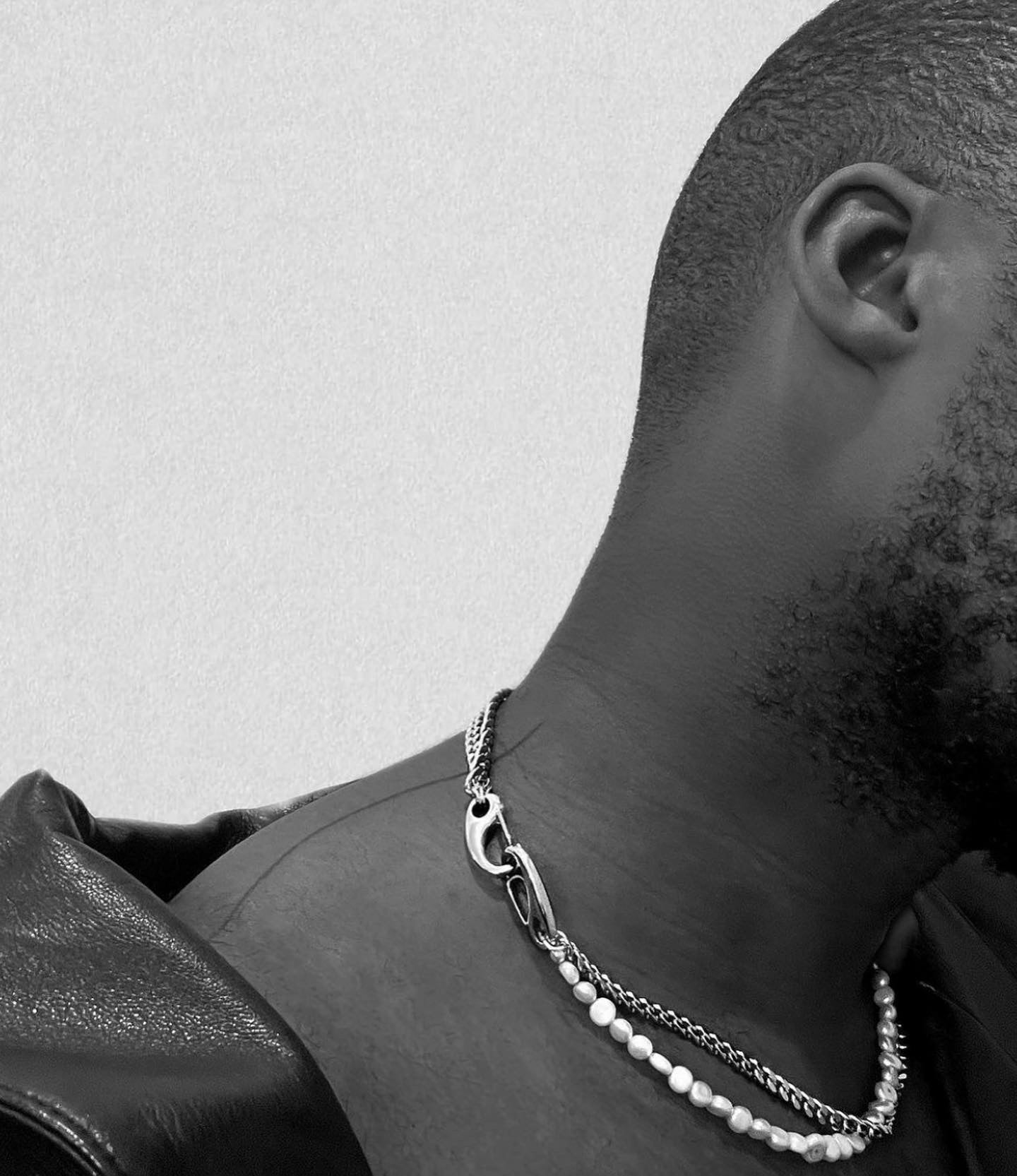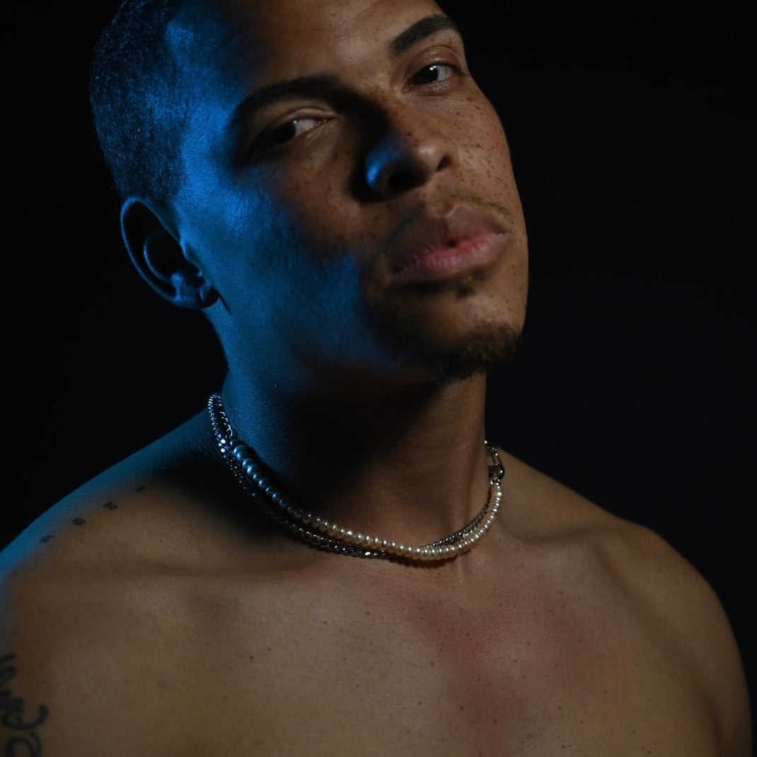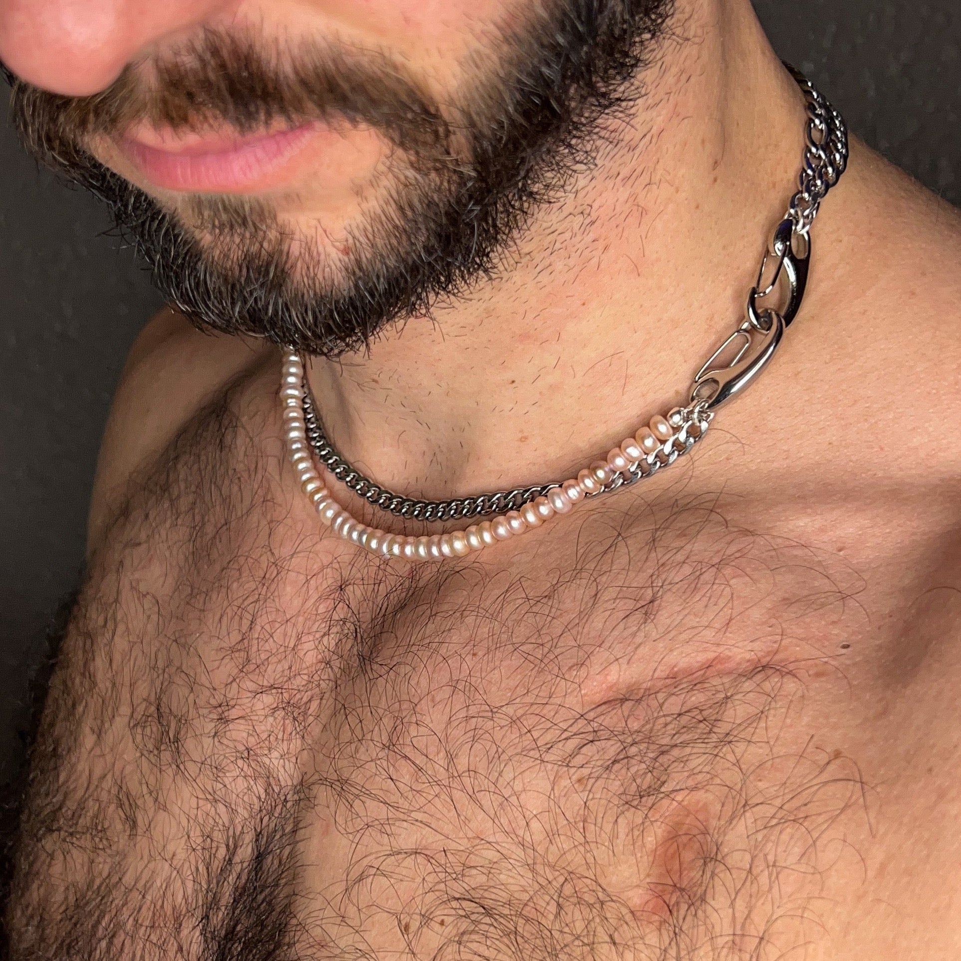 Stainless steel curb and figaro chain twisted together with fresh water pearls and two XL sterling silver clasps.