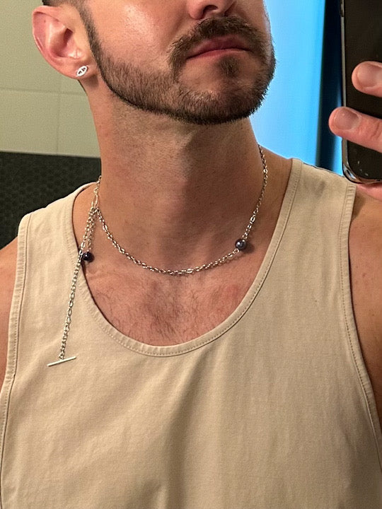 • The pearls’ luster has an iridescent hue that picks up different colors depending on the light (blue/grey/).